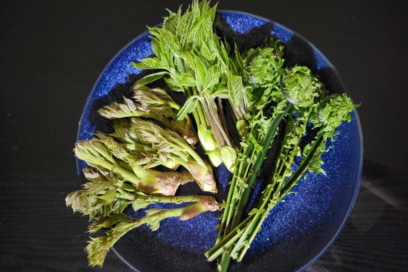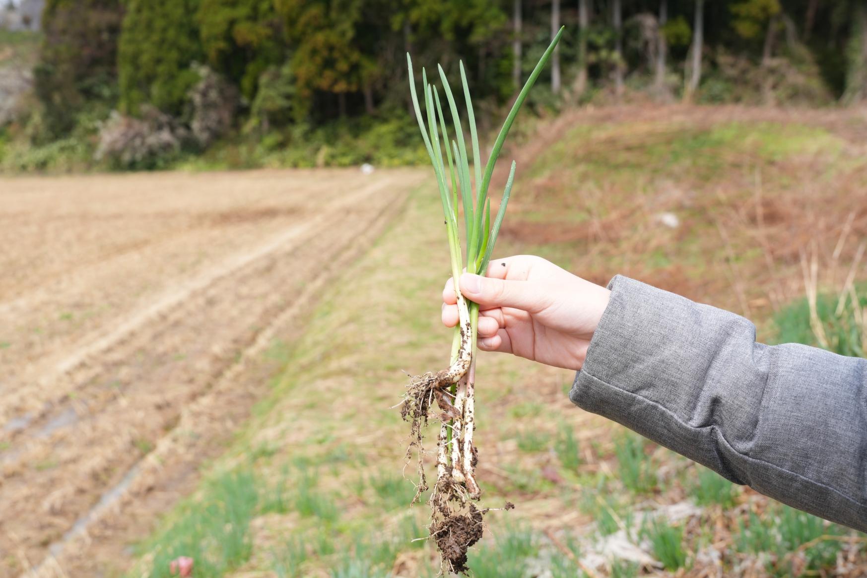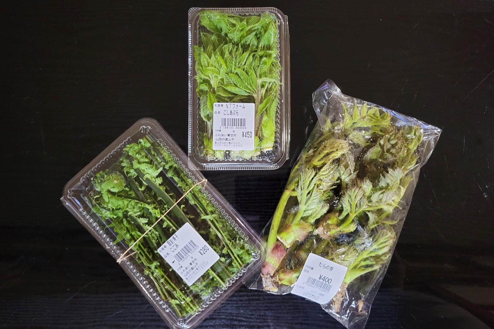 3月に訪れた際、山田地区にはまだ雪が残っていましたが、春の訪れを感じさせる「ふきのとう」をたくさん見かけました。また、お店の前の畑には自然に育った「天然アサツキ」があることを教えてもらいました。さっと茹でて、富山特産の「ホタルイカ」とともに酢味噌で食べると、とても美味しくいただけるのでおすすめです。